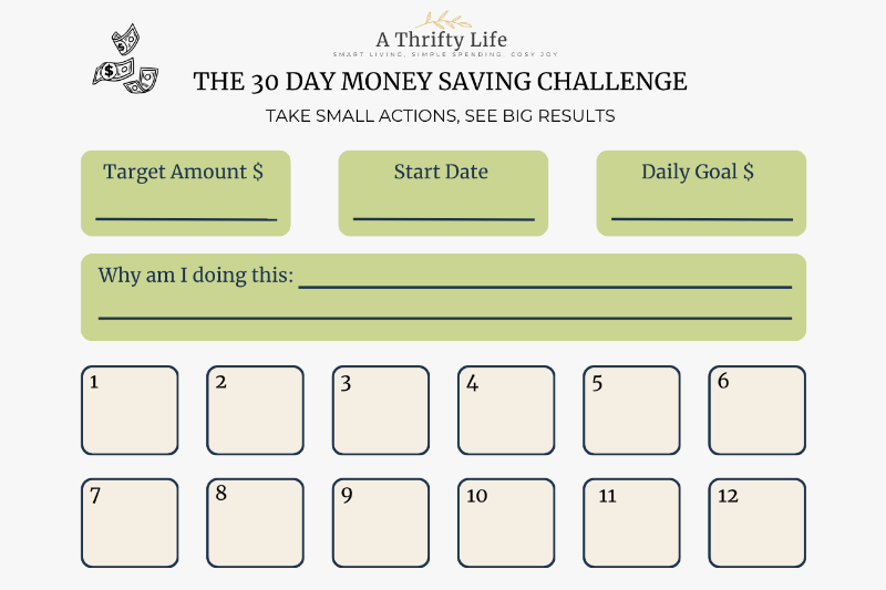 Stay committed to your savings goals with this free 30-day money-saving challenge tracker.